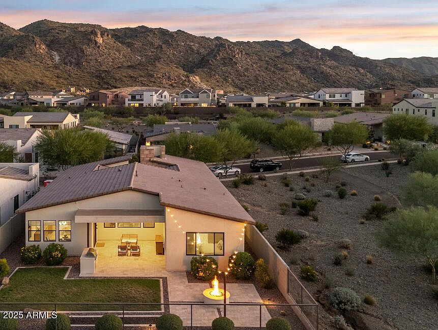 Location, location, location! This setting offers an unmatched openness and connection to the desert. The owners endeavored to create cultivated outdoor spaces that capture the essence of their desert modern surroundings, with seamless indoor/outdoor living in mind. The rear yard was brought to life by Outdoorscapes Designs. The travertine-lined covered patio transitions into patio spaces designed for gathering and relaxation. A custom gas firepit topped with contemporary fire glass becomes a focal point at night, accented by a warm festive glow from the overhead bistro lights. A built-in BBQ area with warmer and side burner provides an outdoor hub for entertaining. Low-voltage landscape lighting illuminates the desert-adapted landscape including agave, shrubs and a sprawling natural lawn, with a programmable irrigation system that keeps everything vibrant year-round. A path lines the side yard for practical use while view fencing above the block wall ensures that city lights and mountain views remain uninterrupted. Peace and serenity are prioritized throughout all the exterior spaces.
