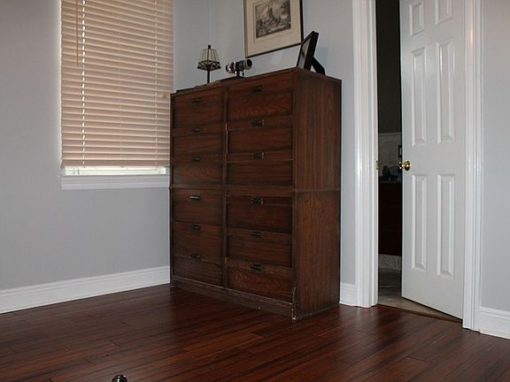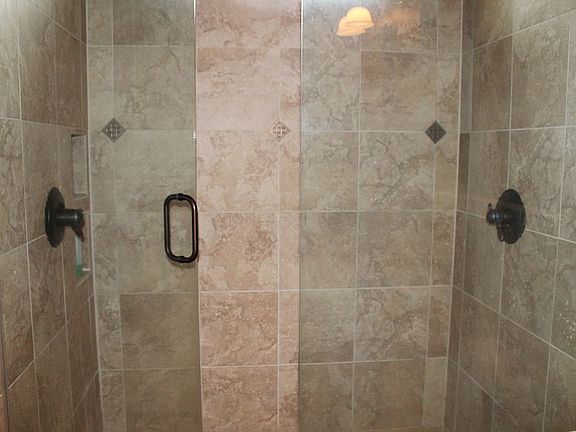 Open floor plan with custom built-in shelving units in great-room, front bedroom and closets which offer architectural detail and storage. The floors are tiles and wood, with the exception of one bedroom which has carpet. Updated Master bath features a tiled shower with frameless door and dualshower heads.