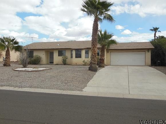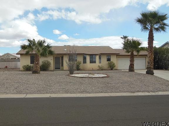 3 bedroom 2 bath home in Sunridge Estates. Open living area with a wood burning fireplace and tile flooring throughout. Kitchen has a double oven with lots of cabinetry. Casual dining area with lots of lighting. Master bedroom has it's private slider leading out to backyard. Master bathroom has dual sinks with separate vanity and shower/tub combo. Large backyard with covered patio. Partial rear fencing. Property just minutes from the Colorado River, Laughlin, NV & Lake Mohave. Buyer to verify sq.ft., floodplain & all utilities.
