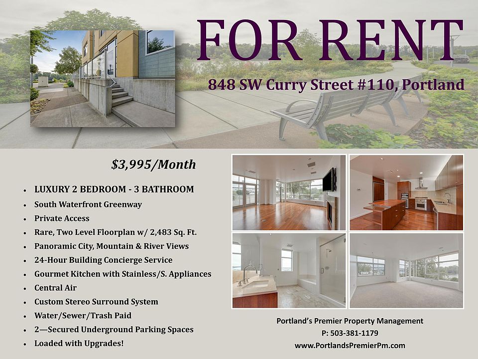 Luxury 2 Bedroom 3 Bathroom Condo on the Water Located in East Merriweather Tower Private Access South Waterfront Greenway Rare, Two Level Floorplan w/ 2483 Sq. Ft. Panoramic City, Mountain & River Views 24-Hour Building Concierge Service Gourmet Kitchen with Stainless Steel Appliances Central Air Custom Stereo Surround System throughout Unit Water/Sewer/Trash Included 2-Secured Underground Parking Spaces Loaded with Upgrades!
