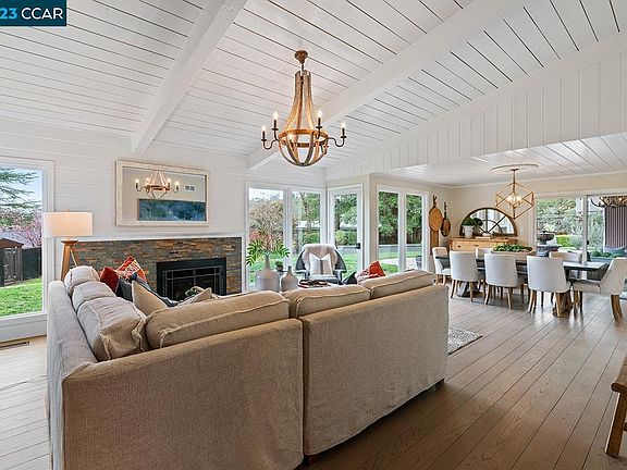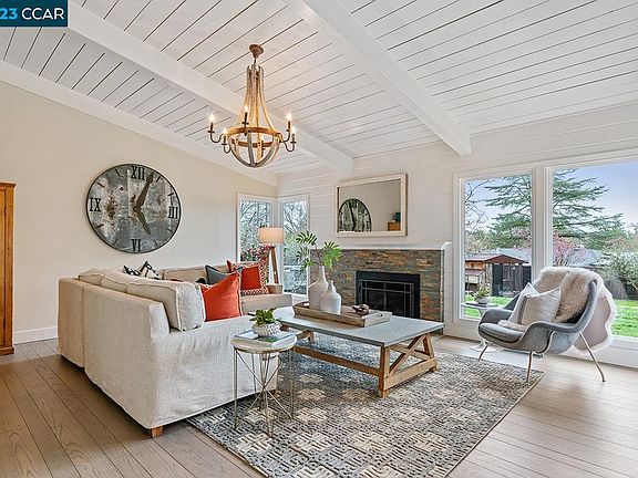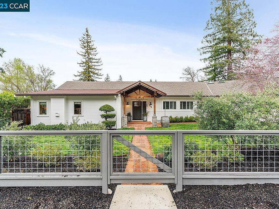 Nestled on a picturesque cul-de-sac near Downtown Lafayette, this single-level ranch home features gorgeous updates and custom details, creating the perfect combination of rustic charm and modern convenience. The large, level lot offers endless possibilities to add a pool, ADU or addition, with plenty of room to spare! The well-loved home features a light-filled living room with beamed ceiling, updated kitchen and baths, and a spacious primary suite with wood beam ceiling. An office nook with built-in desk connects to the fourth bedroom, large enough to serve as an additional living room, guest suite, home office or play room – you decide! The reclaimed lumber used at the entry, above the garage and in the outdoor room was salvaged from the warehouses at the Mare Island Shipyard built in the 1850s! The home emphasizes indoor/outdoor living, with multiple sliding doors that open to the backyard and a covered outdoor room, with corten steel siding reclaimed from Montana. The expansive .39 acre lot allows plenty of room for the level lawn areas, chicken coop, and fenced garden.