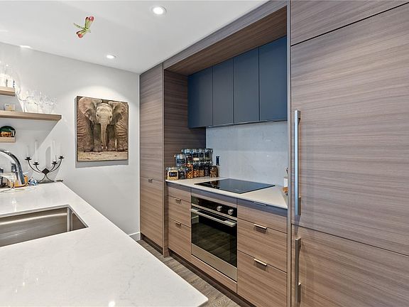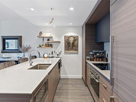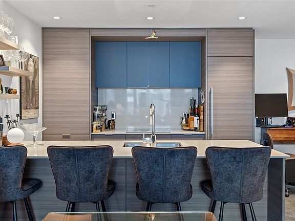 Move in ready! Constructed in 2020, this one-bedroom, one-bathroom home boasts a refined design and an enviable location. A seamlessly integrated open-plan layout, this home is perfect for hosting gatherings or unwinding in comfort. The kitchen is adorned with European cabinetry, durable quartz countertops, and sleek one-piece backsplashes. A convenient pantry with pull-out drawers provides ample storage for cooking enthusiasts. Equipped with top-of-the-line appliances including a Liebherr fridge, Fisher/Paykel induction cooktop, built-in oven, and discreet dishwasher drawer. Enjoy year-round comfort with the integrated air cooling and heating system, maintaining the perfect indoor climate. Residents also benefit from access to the 21st floor rooftop patio featuring gas BBQs, a children's play area and a fenced dog run. This is a serene retreat nestled in the heart of the bustling city. Parking available on monthly basis.