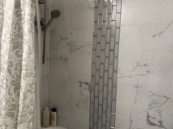 Updated bathroom with marble-style tiles, rainfall shower head, modern vanity, and storage