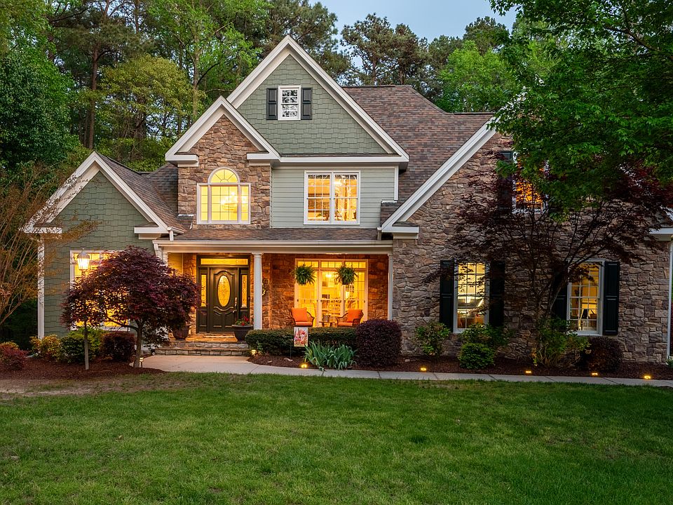 Nestled on a peaceful cul-de-sac lot in Wake Forest, NC, this charming 1 ½ story home boasts a striking exterior with stone and fiber cement lap siding, complemented by painted shake accents and elegant black shutters. A welcoming front porch, featuring a stone floor, a substantial round column, and a black entry door flanked by sidelights and a transom window, invites you inside. The convenience of a side-load two-car garage adds to the curb appeal. Enjoy outdoor living at its finest with a rear screened porch, complete with skylights and access to both an entertaining deck and a separate grilling deck. Inside, discover a main floor living area enhanced by site-finished hardwood floors. The two-story foyer, illuminated by a chandelier, creates a grand entrance. A main floor study, thoughtfully designed with built-in cabinets and bookshelves, offers a perfect workspace. The formal dining room, with its large cased opening and transom windows, is ideal for gatherings. Relax in the family room, featuring vaulted ceilings with skylights and a natural gas fireplace with a granite surround and mantle. The hardwood stairs, recently updated with new handrails and newel posts, gracefully lead to a second-floor walkway bridge. The updated kitchen is a chef's delight, showcasing granite countertops, a center island, a black farm-style sink, a tile backsplash, double ovens, a gas cooktop with a microwave exhaust vent, under-cabinet lighting, and a double-door pantry closet. The breakfast room, open to the kitchen and providing access to the screened porch, is perfect for casual dining. Retreat to the main floor primary bedroom, featuring hardwood floors, a double trey ceiling with crown molding, and a ceiling fan. The luxurious primary bath offers a jetted tub, a separate tile and glass walk-in shower, dual vanities, a private water closet, and a custom walk-in closet with wood shelving and sweater boxes. A convenient powder room with a cherry vanity is located off the main floor hall for guests. The mudroom, complete with a tile floor, laundry area, mop sink, and drop-off bench with exterior and garage access, adds practicality. Upstairs, you'll find three bedrooms, including one spacious enough to serve as a bonus or recreation room, and a full bath with dual vanities and a tub/shower with tile walls. Walk-in access to the attic and HVAC unit provides added convenience.
