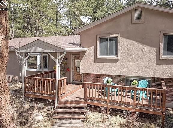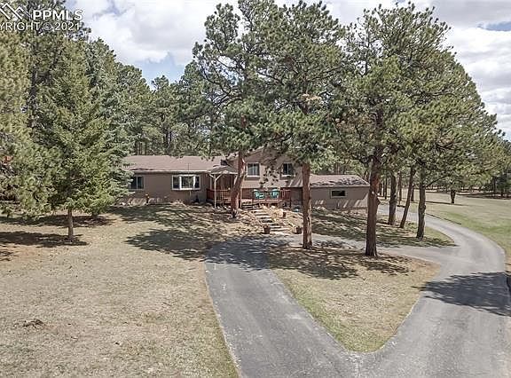 Nestled amongst majestic, Black Forest, Ponderosa Pines, be prepared to fall in love with this beautifully remodeled home! Listed as a split-level, but feels like a 2-story! Enter into a beautiful living room and bright, open floor plan, custom bay window and hardwood floor and tile throughout. The kitchen boasts both an eat-in space & counter bar, granite countertops & gorgeous 42" Hickory cabinetry! A separate dining room features a wall of windows and walk-out to the fabulous back deck! Just off the living room, country barn doors lead to a private, main-level master retreat with hugh walk-in closet and adjoining full bath. Upstairs are three additional, spacious bedrooms and updated full bath w/dual copper sinks. The lower level is re-done to a cozy family room and office area with built-in desk and cabinets! This level also features another remodeled 1/2 bath & laundry with utility sink! The lower level features a huge, hidden storage under the 2nd level of the house! All baths are updated and remodeled with granite! Woodwork was re-done 2 years ago, and there are newer Renewal By Anderson doors and windows throughout! On the grounds of the 2.7+ acre lot, you'll find an asphalt roundabout driveway, front and back decks, fenced yard, 2-car garage with custom garage door, a huge 3-stall barn with indoor chicken pen (30 x 16), workshop & ample storage space, and an adorable outside chicken coop! WELCOME HOME to your part of Black Forest! Seller has active insurance claim to replace roofs on house & barn (to include any other hail damage to gutters, etc.), and is in the process of replacing septic tank & leach field.