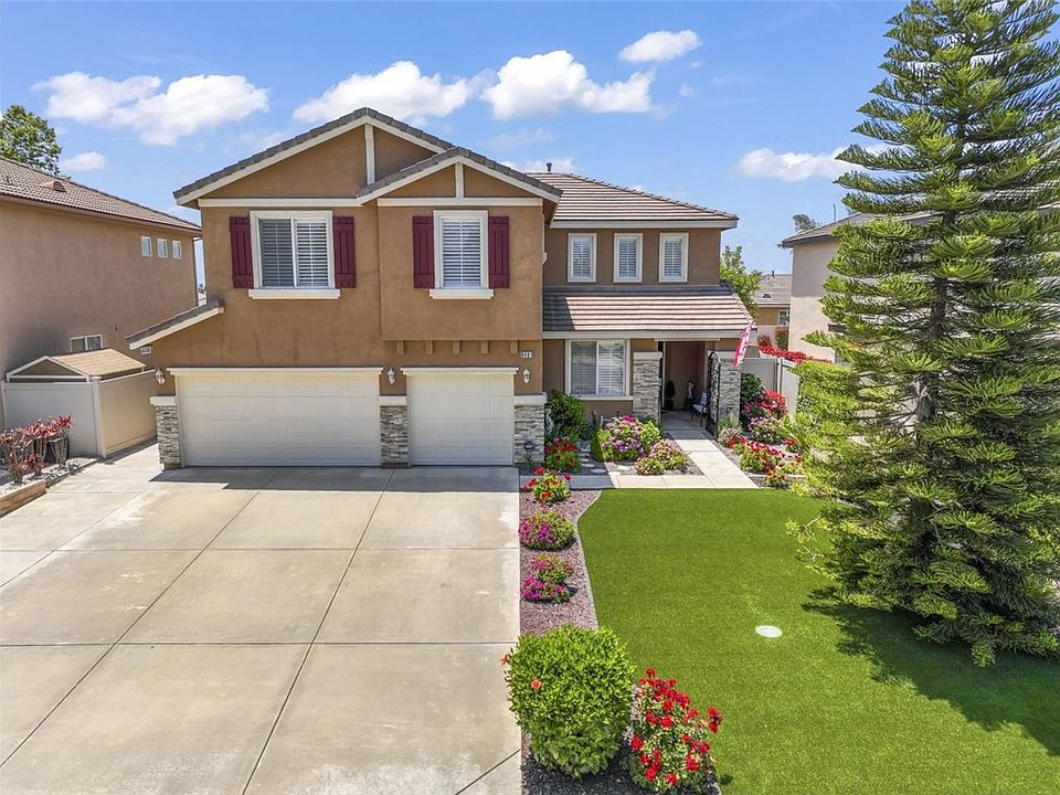Charming, well-maintained home in a quiet, family-oriented subdivision of the highly sought-after neighborhood of Orangecrest where “neighbors look out for each other” and Orangecrest Community Park is within walking distance. Orangecrest and Mission Grove shopping areas are also both a short drive away with a myriad of different grocery, dining, and entertainment options. Beautiful wrought iron gate for security encloses a small private porch area. Double front doors lead to a vaulted yet welcoming foyer, dining, and family room flowing invitingly into the newly remodeled kitchen and the living room with a fireplace and built-ins for a tv and bookshelves. The kitchen includes granite countertops, Timeless finished cabinetry, and built-in bench seat for a small breakfast table. A single glass paned door draws people out to the backyard which boasts several fun and relaxing amenities including a covered patio and separate pergola, both equipped with outdoor ceiling fans, as well as a swing set and built-in putting green(!) plus extra space for a BBQ and umbrella set. The downstairs also boasts a bedroom and full bath, making this home perfect for hosting friends and family! An elegant, curving staircase and balcony lead to the upstairs. A sizable upstairs den with double doors offers a calming retreat for kids or the family. The double-doored master bedroom and bathroom include a separate bath and standup shower, two vanities, and a large walk-in closet, and two additional bedrooms share a separate full bath. The laundry room is also upstairs for easy convenience. Crown molding and shuttered windows throughout the house complete the charm and allow for a versatility of lighting options. The spacious garage can fit three vehicles.