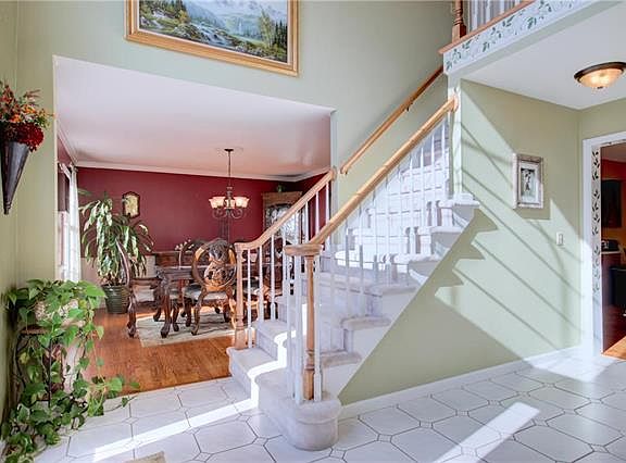 Welcome home to this full brick front custom home in highly desired Pointe West. This light filled home was quality built by Posocco Construction. Two story tiled foyer is flanked by formal living and dining area with beautiful trim work. Hardwood floors flow from the dining area into the cherry kitchen with center island and slider to the back yard. The large family room is complimented by a vaulted ceiling and floor to ceiling brick fireplace with hearth and mantle. Powder room and laundry room with storage finish off the first level. Upstairs you will find a spacious master suite with sitting room and sumptuous bath with jetted tub and separate shower. Add'l 3 spacious bedrooms and hall bath. Lower level rec room and storage room. 2+ car garage. Outside you will find a great environment for entertaining and play area. Conveniently located just minutes from interstates with beautiful views. You will not be disappointed, this home is a must see.