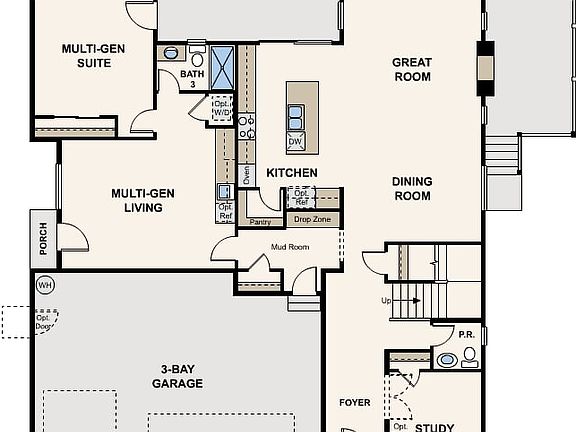 The Garrett offers two floors of expansive living space, with a multi-generational suite--boasting its own private outdoor entrance--four bedrooms, and a main-floor layout that's perfect for entertaining. Toward the front of the home, a convenient downstairs study room is located off the foyer. At the heart of the home, you'll find a well-appointed kitchen--directly adjacent to an extended covered patio--that overlooks a sprawling great room and dining area. Upstairs, you'll find a large bonus room--also available as a smaller bonus room to make space for an extra bedroom--two secondary bedrooms and a generous primary suite, all with walk-in closets.