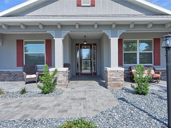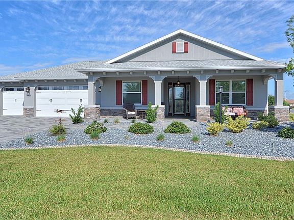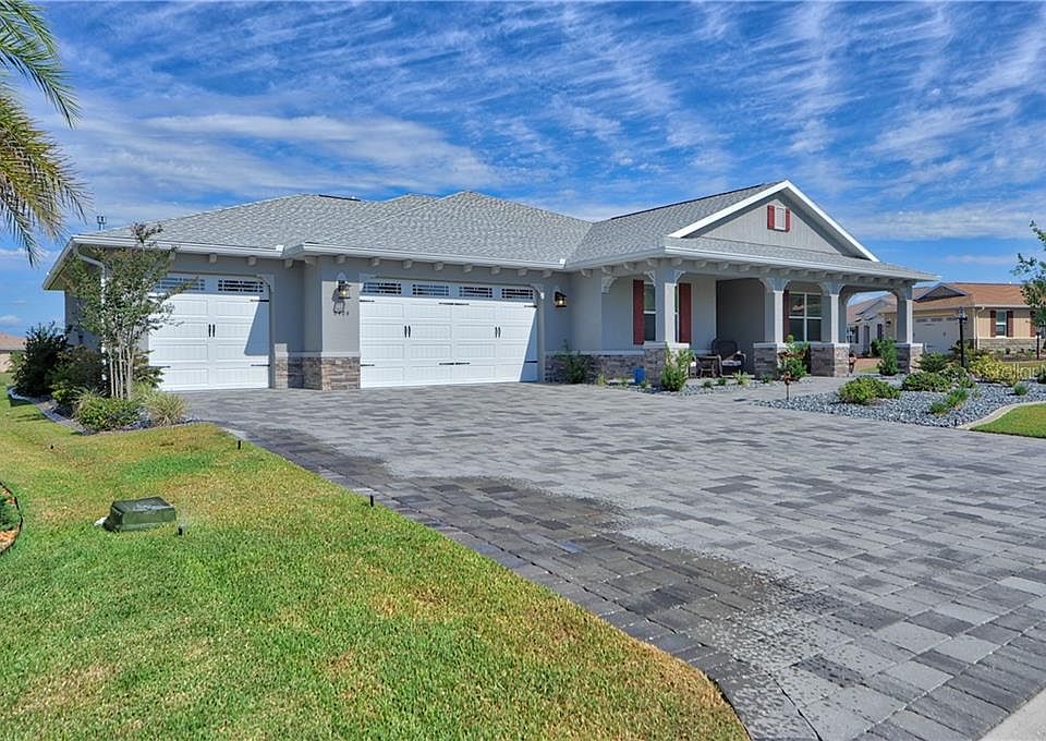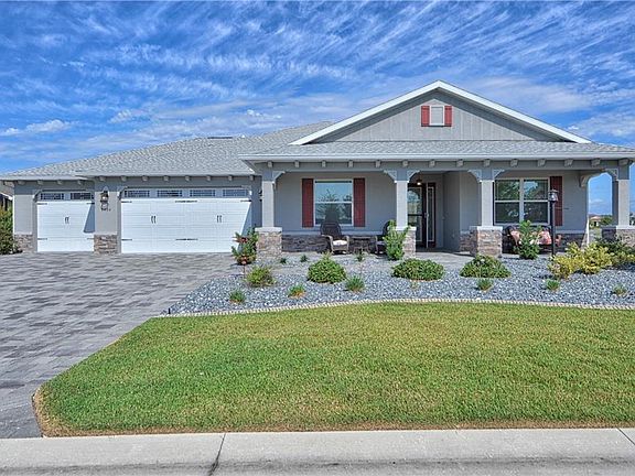 This magnificent 3 bedroom, 3 bathroom, 3 car garage corner lot Argyll home located in the much sought after Stonebridge area of On Top of the World, features a second master suite and a separate bonus room in the garage. Some of the upgrades in this home include, designer pavers in the driveway, beautiful landscape and stone siding that adorned the exterior of this home. Open floor plan with crown molding in the great room, breakfast area, foyer and kitchen. The kitchen has been upgraded with subway tile back splash, pendant lights over the kitchen counter, quartz counters, farm sink, gas cook top, built in oven, built in microwave built in wine rack. 24 inch tiles in the living areas and carpet in the bedrooms. This home features 3 full bathrooms with showers and quartz counter tops. The bonus room in the garage could be used as a man/woman cave. Located in Ocala's premier, gated, 55+ community, loaded with amenities, including golf cart access to two shopping centers.