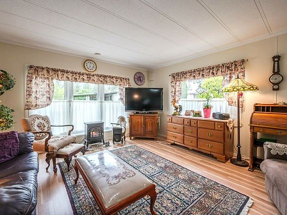 Move - in ready with many updates; Updates include a newer roof, 3 sky tubes, windows, and wired shed. The wired shed is great for storage OR a craft room, art studio or man/lady cave. Outside you'll find your oasis with a large covered deck and a spacious backyard with mature landscaping, tons of room for entertaining, gardening or parking. The possibilities are endless! The mobile is located on a flat lot with an abundance of parking for you and guests. RV parking available within Country Pines. Step inside and enjoy the great open floor plan with a lovely bay window in your living room and an abundance of natural light throughout. The spacious kitchen has room for a kitchen island, dining area and has sliding door access to your covered deck. All the bedrooms are located on the back half of the mobile for privacy and quiet. Centrally located, Country Pines is located 10 min from town and 30 min to Penticton. Enjoy the beautiful park atmosphere at Country Pines with tall trees, green grass, guest parking. Park restrictions include 55+, pets and rentals upon approval. Affordable monthly fee too!