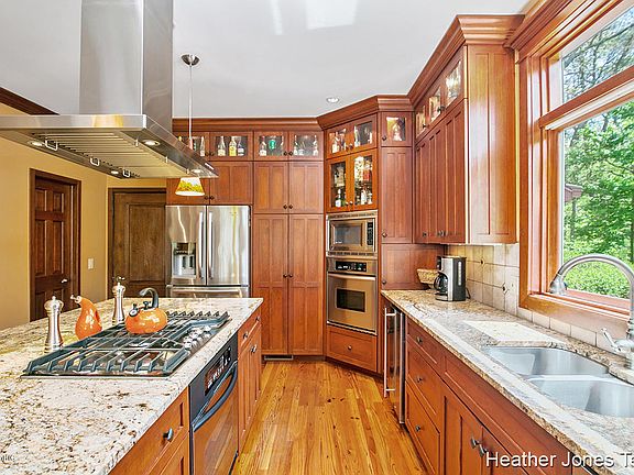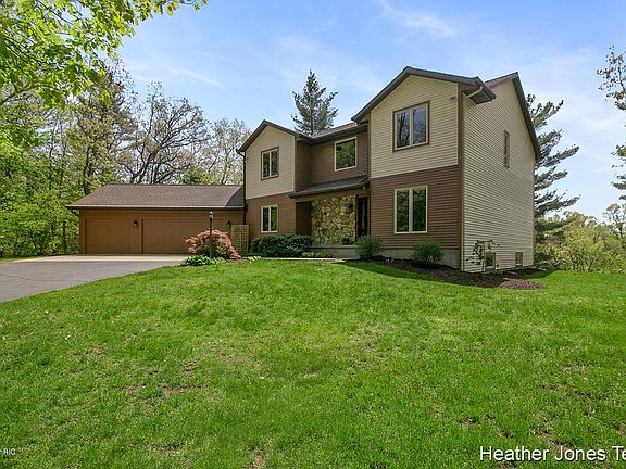 Spectacular 5 bedroom 3.5 bath home nestled in the woods with 187 feet of Flat River frontage. Large chefs kitchen with center island and built in gas cook top, double ovens, granite counter tops, cherry cabinetry, Stainless appliance package, built in desk and large walk in pantry. Main floor laundry with built in lockers. Sprawling main floor features dining room, Living room with slate fireplace and Sunroom with with heated floors, all offering a river view. Upper level features a beautiful master suite with walk in closet, jet tub and tiled shower. Additional 3 bedrooms and a full bath. Lower walkout level with a gym, rec room/family room, 5th bedroom and a full bath. Newer outbuilding with 24x36 area for storage, and a 24x24 workshop. Additional 12x16 shed. This home is a must see!