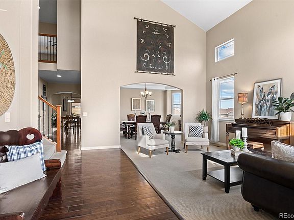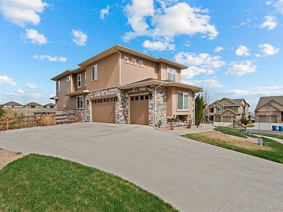 Welcome to Rogers Loop in the prestigious Leyden Ranch neighborhood. As you enter you will notice the impressive grand entrance with soaring vaulted ceilings. Gorgeous hardwood floors greet you as you pass the formal living and dining areas perfect for hosting large gatherings and entertaining guests. The chef's kitchen is a true masterpiece, complete with a large island, granite countertops, stainless steel appliances and ample storage. The kitchen flows effortlessly into the cozy family room which boasts a stunning fireplace and leads out to a raised patio, perfect for enjoying Colorado's beautiful weather. The main level also features a spacious bedroom with an en-suite bath, providing an ideal space for guests or as a home office. As you make your way upstairs, you'll find the luxurious primary suite with coffered ceilings, a fireplace, and an en-suite 5-piece bath that will make you feel like you're at a spa retreat. The primary bathroom features a walk-in shower with dual shower heads, a soaking tub, and his and hers sinks. The large walk-in closet provides ample storage for all your belongings. The upper level also boasts a loft area surrounded by three additional bedrooms, each with their own bathroom. Two of the bedrooms have en-suite baths, while the third bedroom has a bathroom just outside the door, ensuring everyone has their own private space. The finished walkout basement is like a separate apartment, complete with a kitchenette, living room, two bedrooms flanking a full bath, and plenty of additional living space. The Leyden Ranch community offers resort-style amenities, including a pool, parks, and miles of trails for hiking and biking. Surrounded by wildlife and mountains, it is the perfect backdrop for outdoor life. Thus home offers a perfect balance of luxury and comfort, making it the perfect place to call home. Don't miss the opportunity to make this your dream home today! Just 20 mins to the Foothills, Standley Lake and Olde Towne!