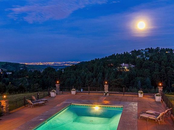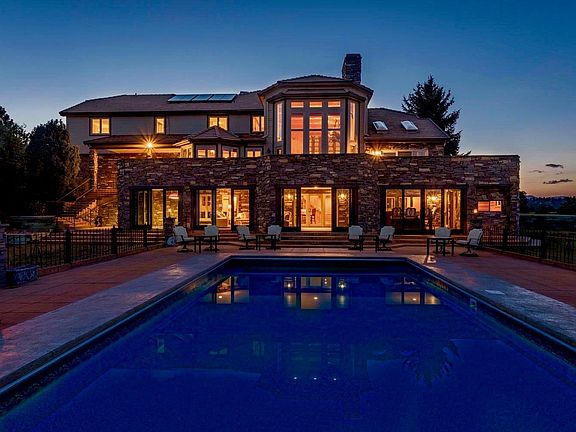 Perched atop a majestic lot with private drive spanning the renowned Riva Chase. This magnificent custom home marries old world style with Colorado living! Boasting privacy in a gated community this home delights in breathtaking views of the mountains & city lights! Unmatched luxury features include a heated salt water pool, an elevator to all floors, exquisite architectural details including custom stained glass from England! The upstairs boasts a large master retreat with fireplace, sitting area and a private deck. There is also a private guest wing upstairs with a bedroom, ensuite bath, private family room and workout room. The lively lower level features a sports bar, newly enclosed patio for outdoor living and entertaining, dry sauna, hot tub room, steam shower, mother-in-law retreat with kitchenette, game room and billiard room! Over $300K in recent upgrades! At last a mountain home with elevator access to all levels. Recent appraisal available.