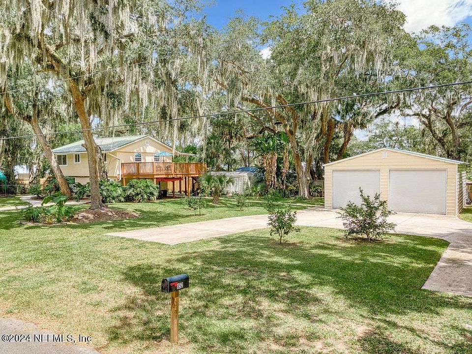 BOATER'S DREAM! Home is on a HUGE, 4 lot, rare parcel just 1 block from Matanzas River in desirable St Augustine South, NOT in a flood zone! Less than 2 mi from Doug Crane & Shore Dr boat ramps. River views from huge wrap around 2nd story deck. 1600 sq ft total outdoor decking and patio area, 1200 sq ft is covered. Enjoy beautiful sunrises in the morning and nice evening breezes off the river. Parking/storage for RV, boat, etc. Property is 4 lots (potentially sub-dividable into two building parcels) with 30'x30' garage including 14'x11' loft and large semi-circle concrete driveway. City water plus irrigation well. 10'x20' and 8'x10' sheds. Multiple citrus & banana trees dot the property. Kitchen, 2 BR and bath, LVP flooring upstairs. Updated bathrooms and kitchen granite countertops. Tankless HW heater. New aluminum roof (2022). Downstairs primary 3rd bedroom en suite, tiled kitchenette, sink, fridge, and a flex space . Great semi-private space for elderly parent, student or AirBnB.
