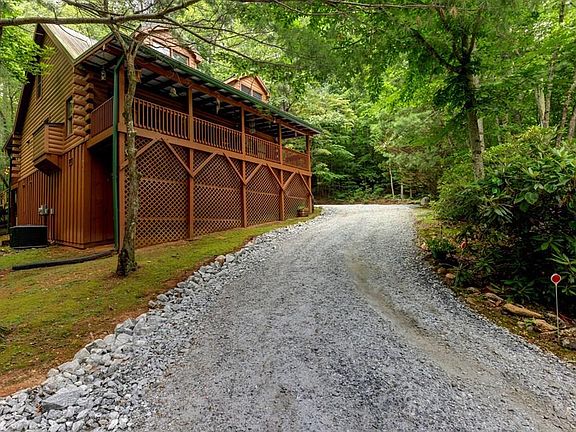 Custom Log cabin nestled in the WNC mountains near Franklin, NC and Dillard, GA. This private two-bedroom, two-bath retreat offers a peaceful escape, featuring a new deck with a hot tub, charming front and back porches for outdoor enjoyment, and a relaxing spot to listen to the nearby babbling creek. Mostly furnished and move-in ready. This D-Log design home features a great room with a vaulted ceiling, gas log fireplace with an antique Oak mantle, hardwood floors, and a beautifully renovated kitchen with granite countertops and new appliances. The spacious main-level bedroom has easy access to an updated bath and laundry area. Upstairs, a cozy loft overlooks the great room, leading to a second large bedroom with a window nook and another updated bath. Also, enjoy a lovely fire pit and picnic area, minimal yard maintenance, and a storage shed all situated on 1.39 acres of unrestricted land. A perfect blend of rustic charm and modern updates—ideal for a mountain getaway, vacation rental, or year-round living.