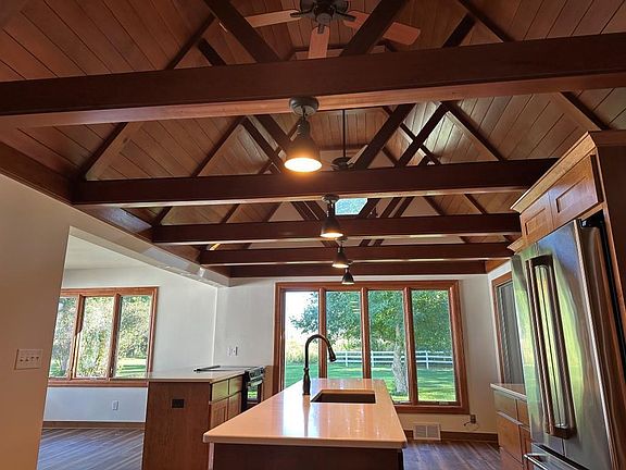 Truly one of a kind! This classy farmhouse is situated on almost an acre just within the City of Stoughton yet, convenience to town. Step into the kitchen and you'll be impressed with the character and craftmanship of the wood ceilings, decorative beams and new Amish cabinets with quartz countertops. This home offers large spaces to entertain and spread out, whether on the three season porch or in the living and dining areas, this home will be a great spot to create memories.