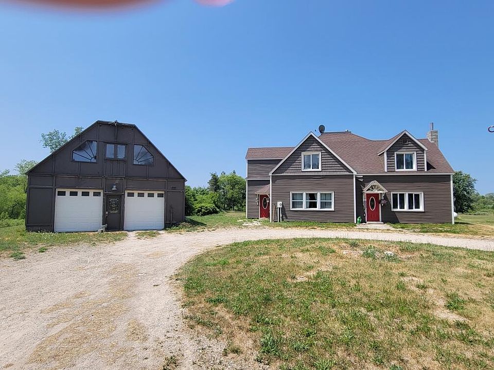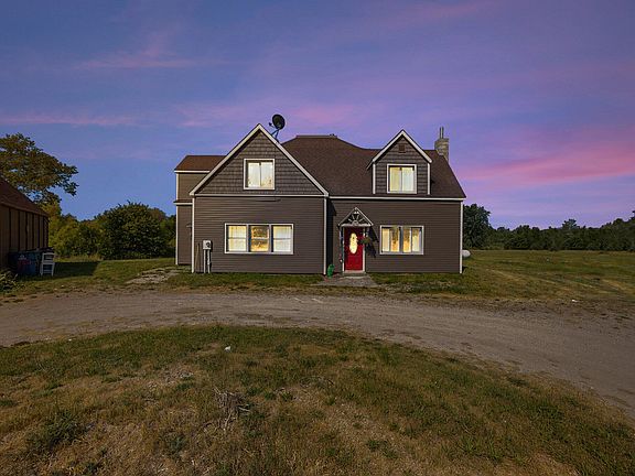 Unique English style Tudor, Two Story on slab with 10.10 acres. Eco Friendly home with 12 inch exterior walls and rain water retention tanks. 3 Bedrooms and Two baths, Master bedroom has large room that could be used as Nursery, office or walkin closet. Living Room with fireplace. Kitchen with hand crafted cabinets, center island and appliances. New washer/dryer 2020, New 2021 Appliances, New carpet 2021, New water softener 2022, On Demand Hot water system, New AC 2019, New siding 2020, New well 2014, septic pumped 5/23, 2019 whole house Ionic air cleaner, Large 2 stall garage with upper level storage. 2 shed's on 10.10 Acres with Garden area and open areas, adjoins the Herron drain. Seller to provide 1 year home warranty to buyer
