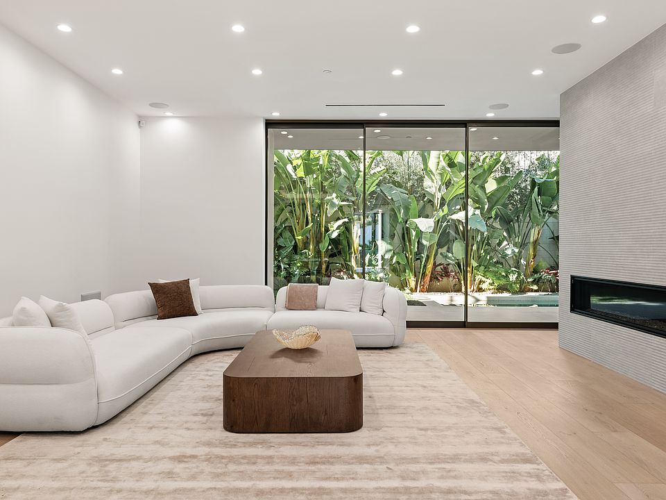 Enjoy a spacious living area with floor-to-ceiling glass doors, a chef's kitchen with premium appliances, and a private theater room for entertainment. The outdoor space is a true oasis complete with a heated pool, spa, Firplace lounge, and lush greenery for ultimate privacy.