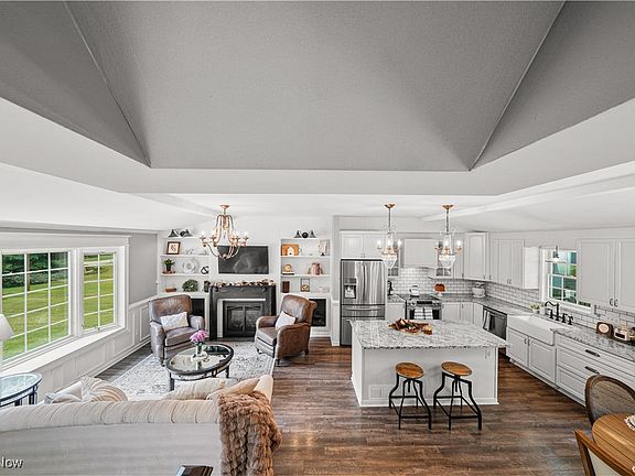 stunningly updated home on 5 beautiful acres in Aurora. This beautifully updated home offers an open concept updated kitchen with Kraft made cabinets, granite counter tops, large island, farmhouse sink and designer chandelier. The living room has built in shelves and lovely gas fireplace and newer bay window. The home has three spacious bedrooms with a beautifully updated master bedroom. The upstairs bathroom has been completely updated. There is an updated 1/2 bathroom and mud room on the lower level as well as a finished basement ideal for office, recreation or work out space.