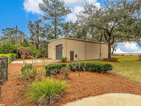 Discover your dream home nestled on nearly an acre of pristine marshfront property, offering sweeping views and an extraordinary lifestyle. This exceptional estate features a custom-built stucco home that blends elegance and comfort, with soaring ceilings, beautiful reclaimed hardwood floors, solid wood doors, and a brand-new roof. Step outside to enjoy a private, screened-in saltwater pool and spa, complemented by an outdoor kitchen perfect for entertaining. The expansive 40’x60’ outbuilding, with a 14-foot roll-up door, provides abundant space for vehicle storage, an RV, boat, or a workshop, offering unmatched flexibility. Inside, the spacious primary suite is a luxurious retreat, complete with dual walk-in closets, a spa-like bath with separate vanities, a soaking tub, and a walk-in shower. The inviting office, located just off the great room, features stunning pecky cypress beams and custom built-ins—ideal for working from home or serving as a cozy den or study. The large great room boasts a fireplace, built-in shelves, and panoramic marsh views.