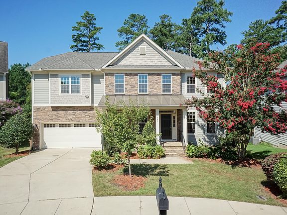 One of a kind east facing house with large garden island in front, 0.26 acre lot backing to green belt. 5 bedrooms, 4 full bath with very spacious bonus that can be used as 6th bedroom. Spacious kitchen with ample of cabinet and pantry space. House freshly painted with new carpet upstairs. Office with french doors and spacious formal dinning. Private deck for entertaining family and guests. Stonewater subdivision is centrally located, minutes to RTP, airport , shopping and almost same time to three major universities (UNC, Duke, NCSU). Community has tons of walking paths with nice swimming pool, clubhouse and play area. Backyard has several fruit trees and raised beds ready for veggie gardening. Tesla wall charger installed.