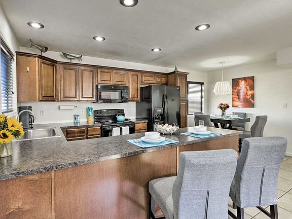 This very successful VRBO was built in 1983 and remodeled in 2017. It has a open living room, streamlined kitchen and dining room area, master bedroom with a walk in closet, a second bedroom with an access door to the backyard, one large bathroom AND oversized laundry/utility room, Once you go into the fenced backyard you will find a wonderful deck and another connected room that could become a bedroom or with modifications, an apartment. Fully enclosed back yard with privacy fencing and plant screening. Close walking distance to stores, restaurants and local businesses. Refrigerator, stove, dishwasher, microwave, washer & dryer will all stay. Heat pump central air conditioning and dual pane windows for energy efficiency. Extra paved parking for a boat or extra vehicles.
