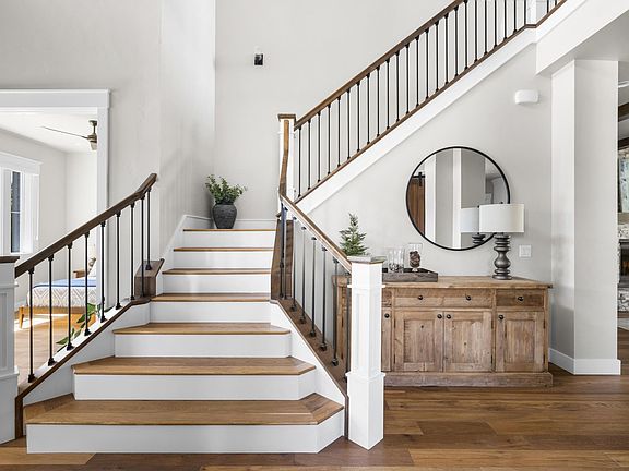 Inside, soaring vaulted ceilings, a dramatic staircase, and sweeping foothill views set the stage. The chef's kitchen, outfitted with quartz countertops, an oversized island, double ovens, and a walk-in pantry, anchors the home. Stylish, high-quality furnishings complement every space, while practical upgrades like a whole-house water filtration system elevate comfort.
