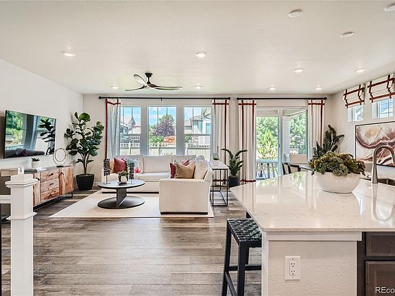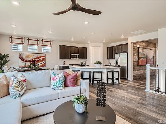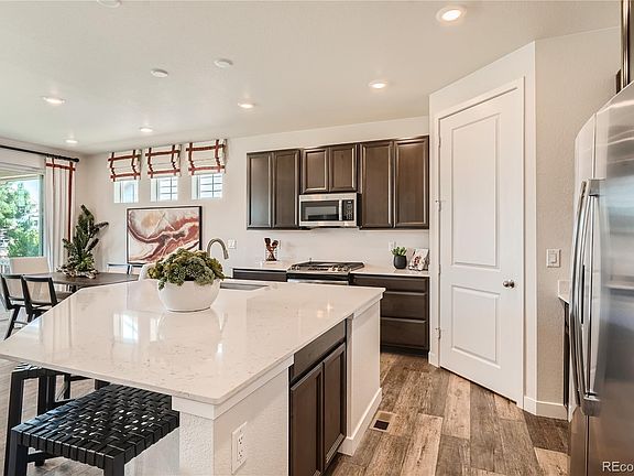 Gorgeous Oxford former Model!! This ranch floorplan has all of the design features! Save money with included landscaping. The main level boasts an open layout and features a chefs' kitchen with an eat in island, quartz countertops, upgraded cabinets, s/s gas range and appliances, open railing, 2 guest bedrooms, full guest bathroom, and owners' suite with spa style en-suite bathroom! The primary closet is conveniently attached to the laundry room. Some additional features include a covered deck and solar. Homeowners will have access to community parks and trails while being close to all that the area has to offer – from top-rated schools to restaurants and shopping. The bustling and vibrant city of Denver is just a 20-minute drive away. **Contact Lennar today about Special Financing for this home** - including below market rates - terms and conditions apply**Available February 2024. Sold As Is! Ask about the Model Furniture!