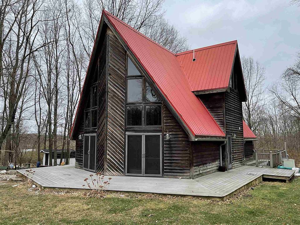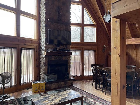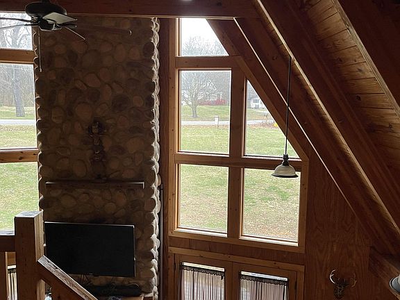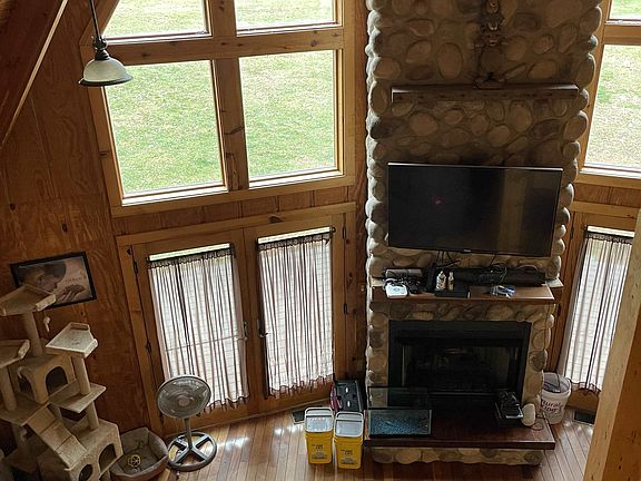 Awesome cedar A-frame on 7 acres. Wraparound deck. 24' ceiling in great room. Stone gas fireplace. Hardwood floors. Solid hickory kitchen cabinets with granite counter tops. Brick floor in kitchen. Lofted master bedroom with master closest and master bath with jet tub and separate walk-in shower on entire second level. Ceramic inlay floor. Finished basement with bar and entertainment area. Barn doors. Bryant furnace. 200 amp service. Pool and swing set will stay with property.