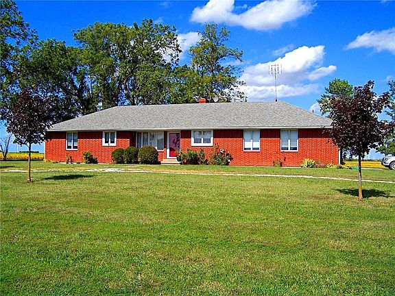 Country Brick Home on almost 2 acres. Delightful, sturdy-built brick home, 3 bedrooms, 2 full baths, open-concept with an amazing brick, wood burning fireplace in the middle that is double sided so a fire can be enjoyed from the living room and the dining area. There is also a large utility room and office on the main floor, plus a 1 car attached garage. The basement has parking for 1 car, is unfinished and full length, and has a tornado shelter room. The home is heated and cooled with a geothermal heat pump (very efficient) and has backup radiant ceiling heat. The back of the home has a concrete patio, a metal shed/garage and pecan trees to the east. A new survey is almost complete to separate the home from the surrounding farm ground and total acres will be near 1.8 acres. This home was built with special care and owned by the same family today. If you are looking for a few acres in the country with a great home, come take a look!
