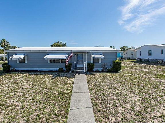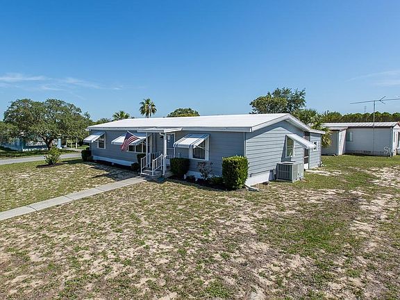 Tired of the up north winters ? Take a look at this spacious home: 3 Bedroom 2 Bath with 1 car carport. Beautiful floor plan with cathedral ceilings, spacious kitchen with lots and lots of cabinets, island with new cooktop stove, refrigerator, closet pantry, large living/dining room combo, Great for entertaining All three bedrooms are generous in size and each has large closets with plenty of storage Additional renovations include: New membrane roof, freshly painted, and light fixtures. Spacious master bedroom, large master bath. Screened lanai, with locked storage area. This home is in a desirable community of Brookridge where you own your own land and it sits on a spacious corner lot in a very quiet location. Walk, bike, swim, play tennis, or pickle ball, bocce ball, shuffleboard or horseshoes, all are located in this Community Conveniently located to shopping, restaurants, medical centers and expressway. This is a must see partially furnished home! Brookridge requires $50 Background fee. Sold As Is for seller's convenience. All room measurements are approximate, buyer to verify.