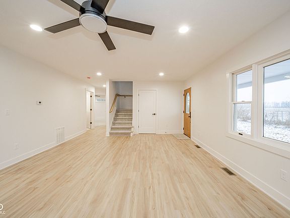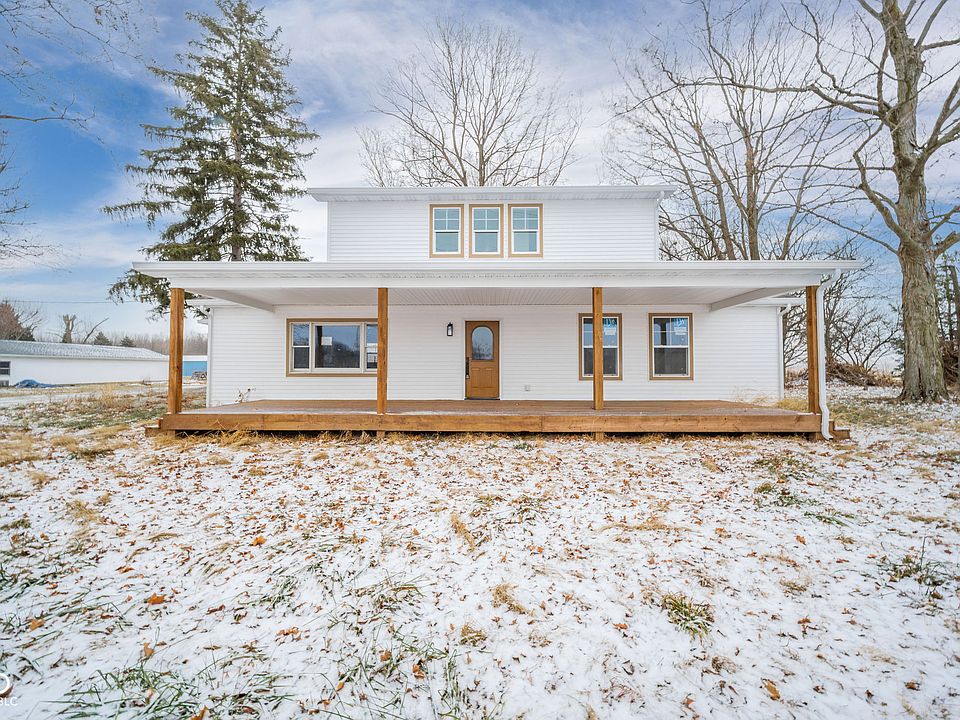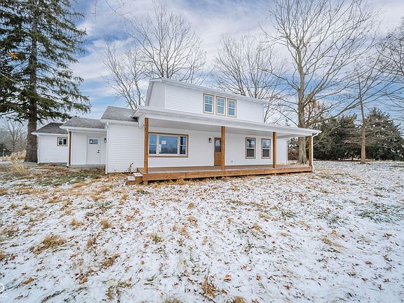A must-see property. This beautifully renovated farmhouse offers 2,200 square feet of thoughtfully updated living space, featuring 4 bedrooms + 3 full baths, all set on 2.22 acres. Ideally located just 4 minutes from Pendleton Heights HS and downtown Pendleton, this home perfectly blends peaceful country living with everyday convenience. Step inside to a light-filled interior highlighted by fresh, neutral paint and warm natural wood tones. The open-concept layout showcases a spacious kitchen with upgraded cabinetry, large island, new stainless steel appliances, quartz countertops and a buffet bar with an overhead microwave. Centrally located, the kitchen truly serves as the heart of the home, providing easy access to the family and friends entrance, laundry room, walk-in pantry, backyard, and attached two-car garage. The main-level primary suite offers comfort and privacy, complete with a beautifully tiled en-suite bath, and a walk-in closet. An additional bedroom and full bath on the main floor provide ideal accommodations for family or guests. Upstairs, you'll find a large, sunlit family room offering flexible living space, along with two generously sized bedrooms, each featuring walk-in closets. A spacious full bath with double sinks and a linen closet completes the upper level. Outside, the property continues to impress with an oversized covered front porch, a refreshed gravel driveway and parking area, a large barn, and mature trees; including apple and peach trees, adding to the home's timeless charm. This inviting farmhouse truly captures the essence of country living. Schedule your showing today.