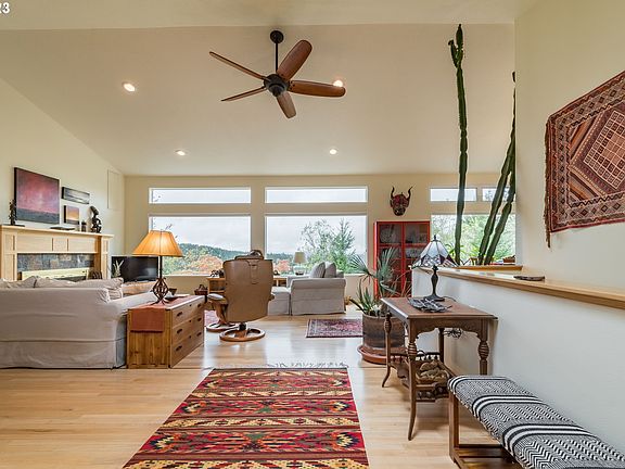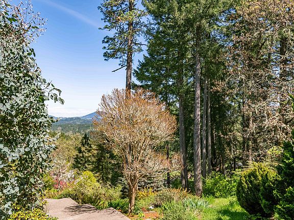 Northwest contemporary home with amazing views of Spencer Butte, the Coast Range Mtns & Fernridge Lake. Clerestory windows, skylights, vaulted ceilings, hardwood floors, living rm w/wood-burning fireplace & gas starter, spacious kitchen w/granite counters, island, gas cooking, & eating area, dining room w/French door to deck, office, master suite w/walk-in closet, shower, soaking tub & dual sink cabinet. The finished daylight basement has utility room, 2-guest bedrooms (Note: one guest bedroom does not meet code for egress but can be remedied), family room w/access to patio for entertaining, & garage entry. Home is plumbed for bi-vac, surround sound and has generator. Gated entry, deer fenced garden area w/raised garden beds, peach, apple & pear trees, circular driveway. 4J schools. Low county taxes.