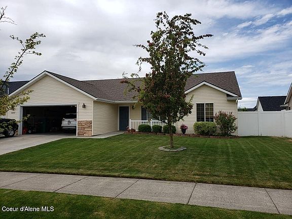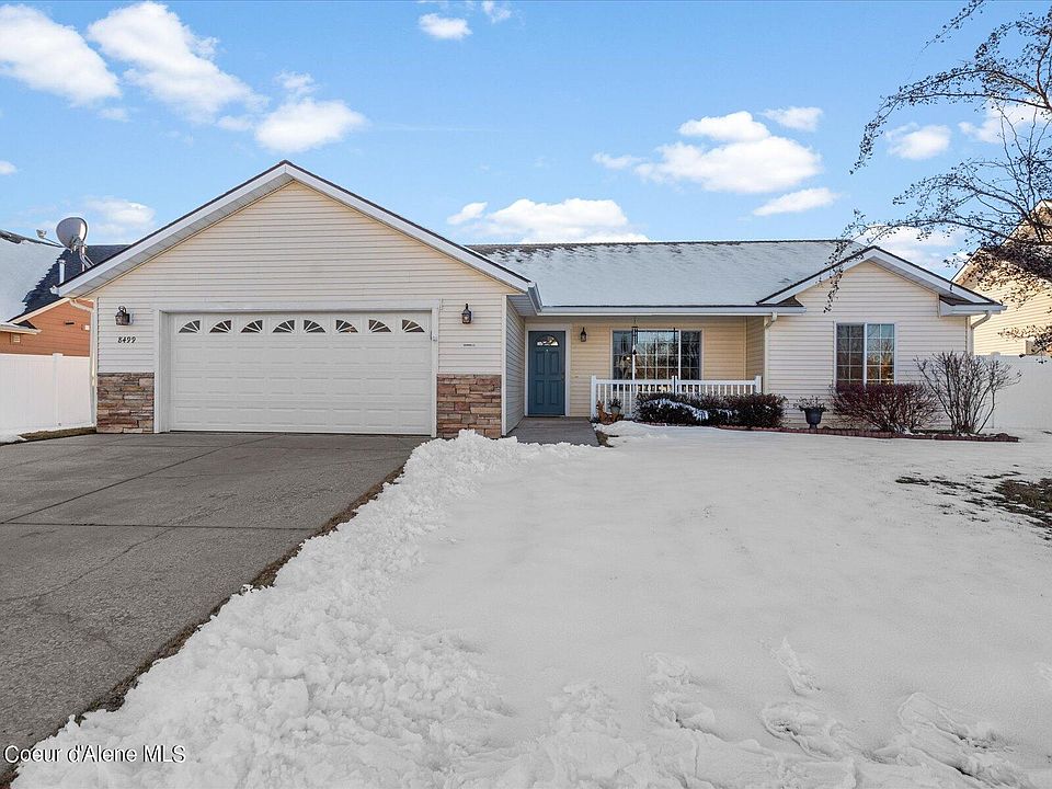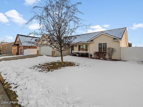 Convenient single-level living in Hayden's Strawberry Fields community! This light and bright home boasts an open-concept floorplan with soaring vaulted ceilings, lovely LVP flooring throughout, kitchen with stainless steel appliances & breakfast bar, and ADA modifications such as handrails, and 3-foot wide doorways. 3 spacious bedrooms, including the primary suite located separately from the others, and boasts a walk-in closet, private full bath, and attached additional room.. perfect for a workout space, home office, or hobby room! Covered front porch, covered back patio, fenced yard with large lawn space, and attached 2-car garage. Located near parks, schools, dining such as Chomper Cafe, shops, Hayden Lake, commuter routes, and more. Welcome Home!