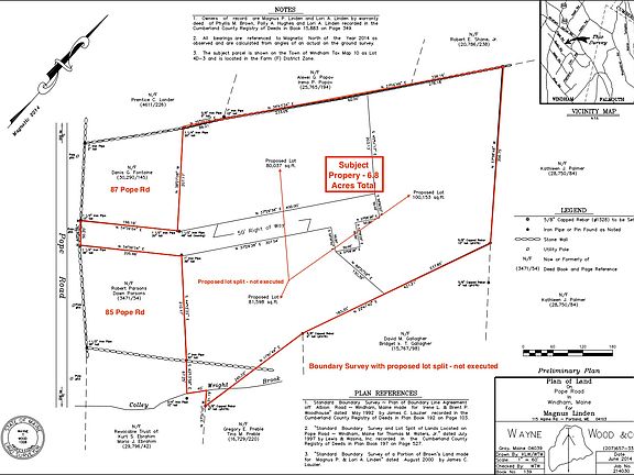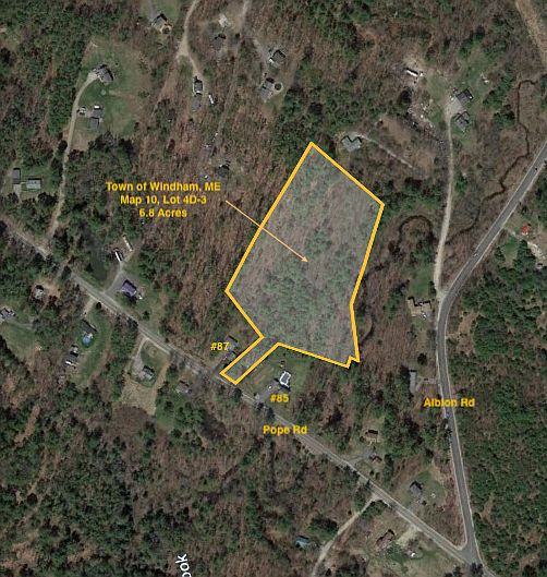 FOR SALE BY OWNER – 6.8 acre wooded lot conveniently located southeast of N. Windham commercial center in Farm (F) district Zone, with easy access to: - Public schools (1.5 miles) - N. Windham shopping center (6 miles) - Rt 302 for commuting to Portland (11 miles) Site, located on northwest side of the Colley Wright Brook with some stream frontage, is being sold as a single parcel. Boundary survey completed in 2014, and the property has access to public water and all available utilities from Pope Rd. Build your own home on whole secluded parcel, or subdivide in up to three, 2-acre lots. Current owner can subdivide existing parcel to two lots prior to sale, if so desired. Call/email Magnus 781 589-7332; magnuslinden59@gmail.com