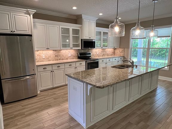 Spacious FIVE BEDROOM, THREE BATH home with a fenced yard in Fiddler's Reserve gated community. This nearly new home features plenty of parking with the attached 2-car garage & circular driveway as well as a large covered lanai. Large living area with wood-look tile floors throughout. The formal dining room connects to the kitchen through a butler's pantry featuring an additional refrigerator, cabinetry, and a walk-in pantry with wood shelving. The expansive kitchen offers plenty of prep space with a large breakfast bar. The indoor laundry/mud room boasts loads of storage and a soaking sink. The master bedroom suite offers a separate soaking tub and tiled walk-in shower alongside a double vanity with makeup area. The private water closet and supersized walk-in closet complete the primary suite. With an additional bedroom and a full bath on the main level just off the foyer, there's an extra living area upstairs with a separate nook space. Three more bedrooms, a full bath with a separate vanity area and a flex room complete the upstairs. This home also includes a water softener system. Fiddlers Reserve HOA provides the lawn maintenance and leasing includes access to the community pool, playground, fitness center and more. This home is located near schools, shopping, dining, and medical facilities. Easy quick access to I-95 for an easy commute to Kings Bay Submarine Base, Brunswick and Jacksonville.