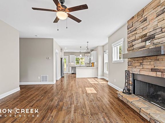 This four-bedroom, three-and-a-half-bath home features an impressive open-concept main level with rich hardwood floors, a striking stone fireplace (decorative only, not for use), and a chef's kitchen outfitted with white cabinetry, granite countertops, stainless steel appliances, and a center island perfect for entertaining.