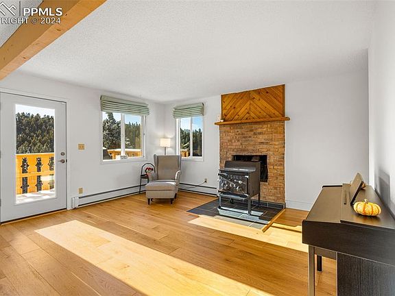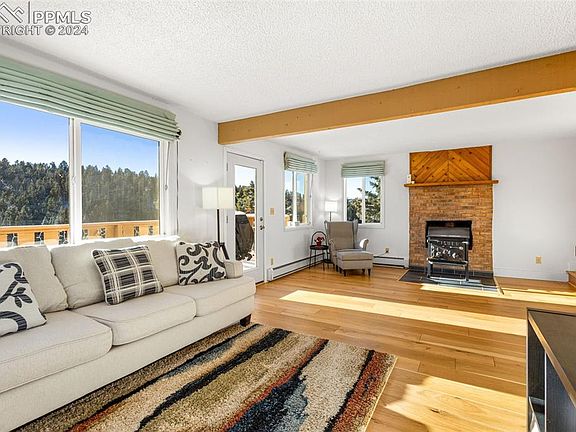 Nestled in the picturesque town of Divide, Colorado, this charming 3-bedroom, 2-bathroom mountain residence is a perfect blend of modern comfort and mountain living. Experience the surrounding natural beauty from this elevated, 1.4 acre corner lot, overlooking the trout-stocked lakes that the Highland Lakes neighborhood has to offer. This move-in ready home features countless updates, including; brand new carpet, fresh paint, updated bathrooms, engineered hardwood floors, septic, new doors, and more! The main level includes a separate dining area, remodeled full bathroom, a spacious kitchen equipped with granite countertops and a new dishwasher, a large living room with a wood burning stove, and access to the walkout wrap around deck. Upstairs you will find the master bedroom with its own walkout balcony overlooking the lakes below, a second bedroom with newly updated with tongue and groove ceilings, and a beautifully remodeled ¾ bathroom. The lower level has a large, newly updated 3rd bedroom, laundry room, and an office space with walkout access to the lower patio and hot tub. Outside you have a heated 2 car detached garage, additional RV parking, storage shed, and playground. This property is on association water and is within a voluntary HOA community, allowing access to the community center, fishing in the 7 private trout lakes, kayaking, paddleboarding ice skating and more! Seller's Furniture, starlink internet hook up and security system are negotiable. Book your showing today!