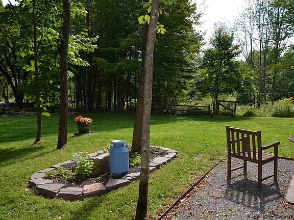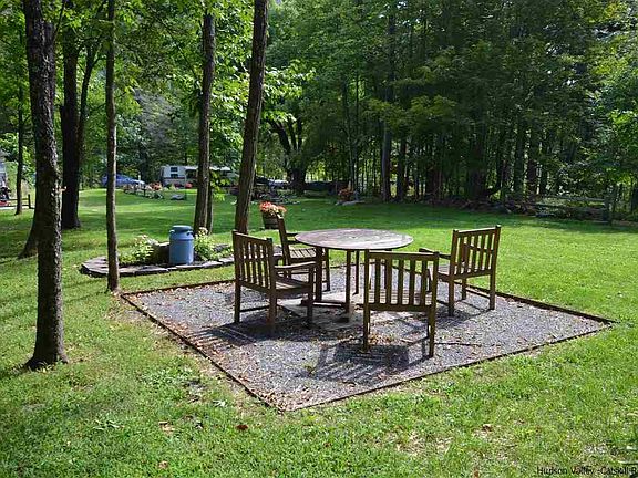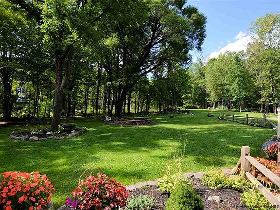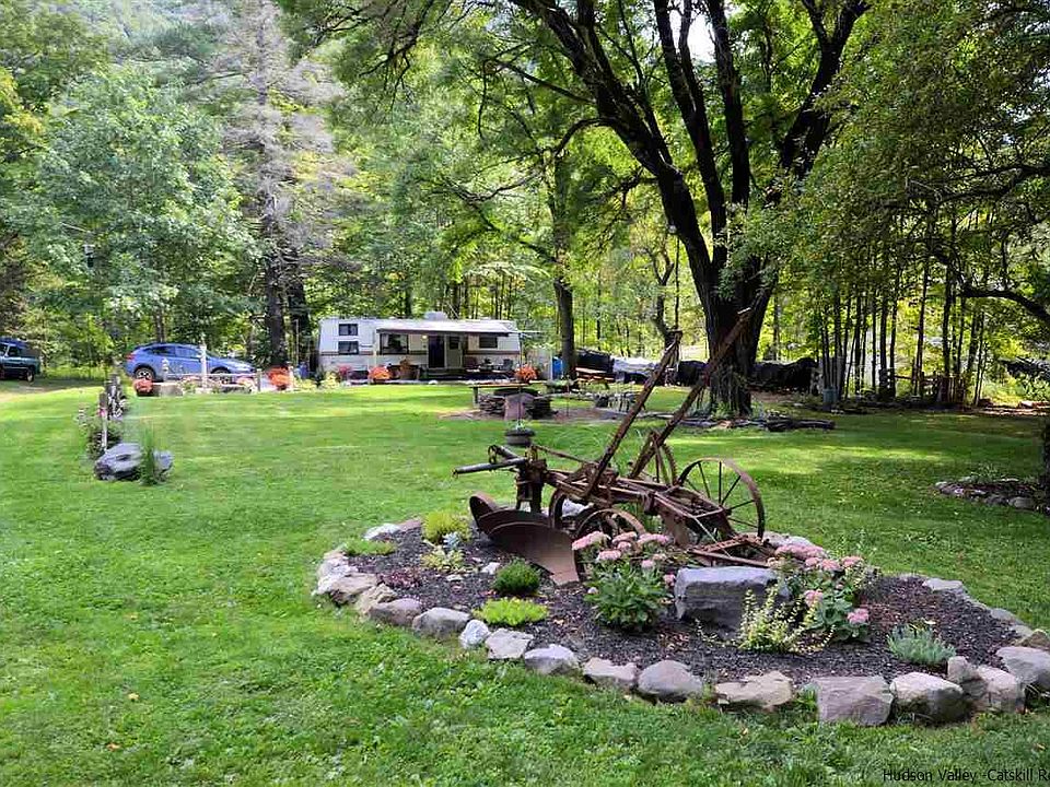 Enter to the ruins of the former Ruggles Houses a 20 room boarding house on the right, then to left a camper with professionally landscaped grounds, follow the path to a historic old cemetery beyond that is 135 acres of DEP land and beyond that several hundred acres of NYState forest Underground electric is there, the camper is included with various lawn equipment. The house must torn down and removed. Condition of any old waste disposal or water is unknown.