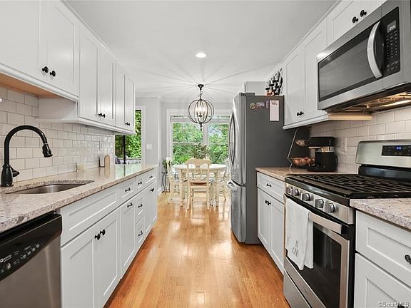 Unique and updated Metropolitan Townhouse unit at the upscale River's Edge complex in upper Springdale near the New Canaan/Darien border. Beautiful new white shaker kitchen with quartz counters and S/S appliances, new gas range and ice-maker refrigerator. Kitchen opens to charming breakfast area with door to balcony. Spacious layout with wider & larger living areas. Master bedroom has lux marble bath with hydro tub & separate shower. 2nd full bath upstairs and remodeled guest half bath on main level. Huge windows, hardwood floors on main level, oversized bedrooms upstairs with vaulted ceilings and generous closet space. Gas heat and 2-zone central air systems. Bonus 1st floor den with laundry and sliders to patio. Country-club style living with recently remodeled clubhouse, community room w/fireplace, state-of-the-art gym, and large in-ground pool. Walk to Springdale Village amenities, train station, restaurants & shops. Super low common charges, fantastic townhome opportunity!