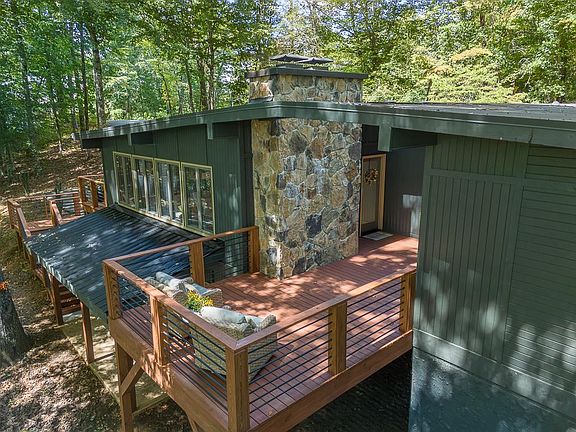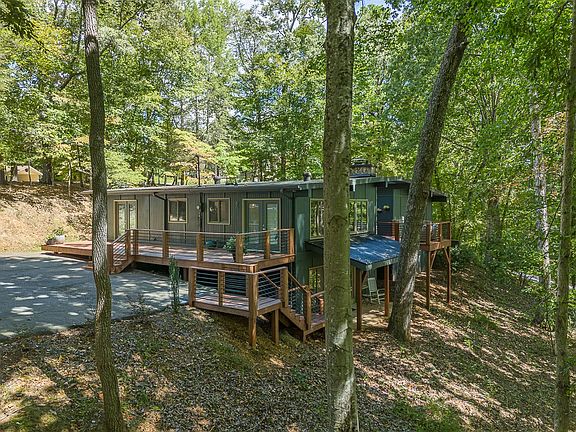 Welcome to this stunning modern interpretation of Frank Lloyd Wright inspired architecture. This special home gives the feel of solitude with the perks of all that the town of Murphy has to offer. Renovated in 2023, with an open kitchen, living space with many windows to bring in lush green views creating a feeling of living in a tree house. At the same time, the custom cabinets, sleek quartz counter tops and custom electronic shades provide modern comforts. The bathrooms are beautifully updated with tile showers and quartz counter tops for a spa-like touch of luxury. The versatile lower level, perfect as a 4th bedroom or bonus space, provides flexibility to suit your lifestyle. Situated on an oversized private lot to enjoy two spacious decks and a fire pit/patio area for entertaining. With two driveways and a two-car attached carport, complete with extra storage, there's plenty of room for parking and outdoor projects. Tastefully furnished and turnkey, this exceptional home is ready for you to move and experience a balance of modern comfort and mid-century style architecture.