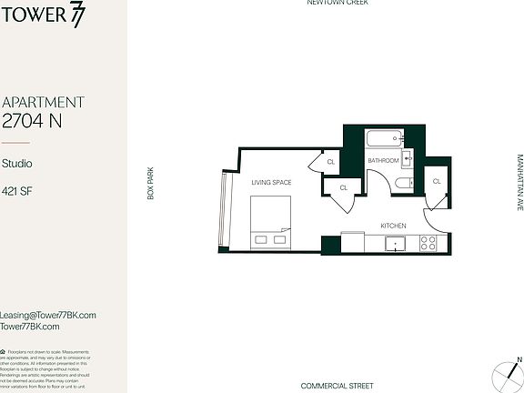 WATER VIEW STUDIO WITH MANHATTAN VIEWS WASHER DRYER IN UNIT. OPEN HOUSE SHOWINGS BY APPOINTMENT ONLY. THIS IS THE SAME UNIT AS 77 & 87 COMMERCIAL - TOWER 77. ONLY 1 APPOINTMENT NECESSARY TO VIEW ALL BUILDINGS. CALL/TEXT/E-MAIL TO VIEW! ALL SHOWINGS BY APPOINTMENT ONLY. SOME PHOTOS ARE VIRTUALLY STAGED. Apartment photos are not of the actual unit and have features that may not be represented in all homes. Only one appointment is necessary to see any home in this brand-new luxury building with an unparalleled 40,000 sf of world-class amenities designed with your health, wellness relaxation and entertainment in mind. Welcome to Tower 77 a new luxury high-rise on the Greenpoint, Brooklyn waterfront. This gorgeous new building is located steps away from the new esplanade with access to the Ferry for a quick commute into Manhattan. The Apartments: Modern, custom-designed vanities with floating mirrors Elegantly appointed porcelain tile flooring and Irish Blanco tiled walls High-end matte metal Pewter fixtures and fittings Bathrooms with Sleek Stainless Steel, Energy-Star Rated appliances Light colored Sand Oak & White soft-close cabinetry with under-counter linear lighting Stylish white Silestone Quartz countertops and backsplashes Expansive kitchen islands with upscale pendant lighting in select units Open-concept, flexible floor plans with abundant natural light Elegant White Oak hardwood flooring throughout Bosch Stacked Washer & Dryer Set in select units Eco-friendly design features, including energy-efficient lighting, appliances, low-flow fixtures, and superior performance window shades. The Amenities (additional fee): Outdoor Tennis Courts Indoor Pool designed for year-round swimming with direct access to Outdoor Pool Deck Relaxing Sauna with built-in wood benches with backrests Multiple outdoor BBQ grilling areas with preparation space, wet bar, outdoor State-of-the-art Fitness Center with the latest in strength training and cardio equipment Wellness Studio outfitted for barre workouts, yoga, and stretch sessions Outdoor Basketball Half Court Kids' Room with an indoor playground and movie-screening lounge Game Lounge with billiards, shuffleboard, and comfortable seating areas Multi-purpose Room with co-working space Indoor Lounge featuring seating nooks for semi-private space as well as room for entertaining including over-sized community dining table, catering kitchen with bar space with a seamless flow to the outdoor lounge deck space Building fees (some optional) $20 application fee per applicant, move-in fee, move-out fee, bike storage per bike (optional), annual pet fee per pet (non-ESA/service animals), monthly storage (optional), Amenities (optional), Garage (optional)