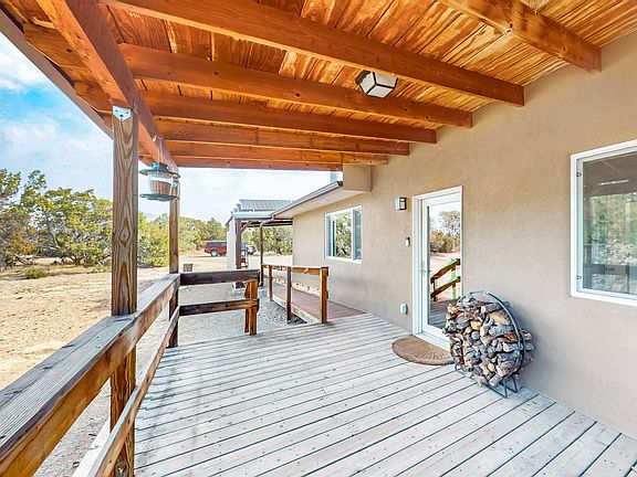The wait is over for the best mountain retreat in the East Mountains. This adorable home sits on 5 plus wooded acres, owned active solar (8,000 Kw annual production), an amazing updated kitchen, two outdoor living spaces in the front and back, a solid car port, with extra storage inside and outside, green house, chicken coop, 3 spacious bedrooms, primary suite with a 3/4 bathroom, laundry closet with an utility sink, bright and open living room with a wood stove and extra space for a home office. End of the road privacy affords you the ultimate privacy on this wooded lot at the top of the hill with amazing mountain views and wildlife viewing. This home is on Entranosa with a water softener and has a backup generator for the days you may need it. Make an appointment to view this home today!