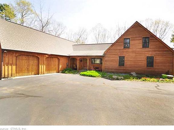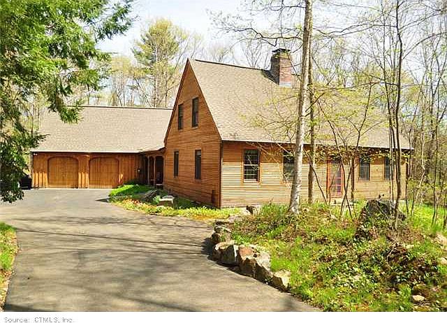 Stunning former architect owned and built Cedar Sided Custom Post and Beam Country Cape meticulously maintained and updated on a beautiful 2,25 acre wooded lot abutting state forest. Private tree lined driveway and perennial gardens surround this exceptional 3 bedroom two bath home. Spacious skylit cathedral master bedroom with his and hers closet options, jacuzzi skylit bath spacious bonus room office all on 2nd level. First floor boast huge brick floored barn style country kitchen with custom island, cabinets and countertops flowing to expansive and open 9 ft tall beamed dining and living areas with massive earth stone fireplace with pellet stove. Rare mohogany and pine floors, doors and hardware throughout. Two additional private bedrooms and bath on first floor creates a complete family home or a home to graciously cater to special guests. Open basement with high end furnace, bonus room, pellet stove and water mitigation system. Three car heated garage and or workshop with welder, compressor and generator hookups. Side country rocker stone porch and large back deck for entertaining. Come to Stafford Springs and enjoy our quaint Main Street Shops and Restaurants in a Mayberry like setting and atmosphere where our residents are our most revered attraction.