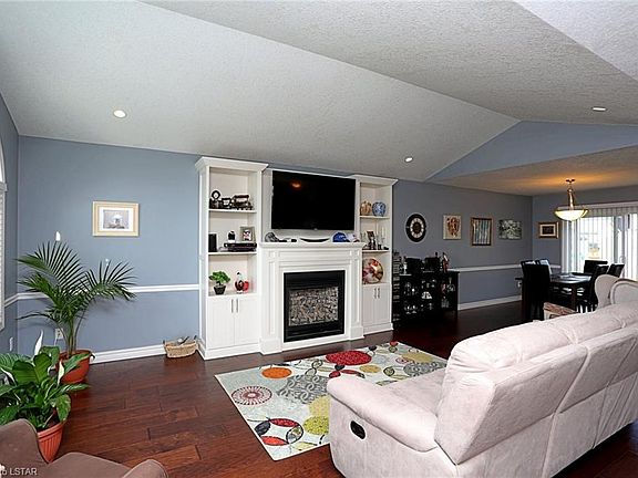 Beautiful 10 year old open concept brick bungalow located in north Strathroy close to schools, sports facilities, shopping with easy access to 402. Lovely open concept home features two bedrooms with generous 3 pc ensuite, main floor laundry with washer/dryer included, large windows with vaulted ceiling in living room with gas fireplace and custom built mantle and book case, patio doors off dining area leading to patio area with a fenced rear yard. Spacious working kitchen which comes with 4 appliances, engineered hardwood in living room, dining room, kitchen and hall (2017). Large family room in lower level with extra bedroom. Don't miss the unique access to the storage room! Great home in a great location, perfect home to retire in or raise a family.