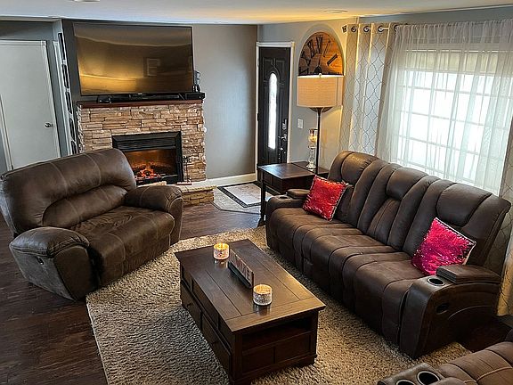 Main living space features an open floor plan including an electric fireplace. Main floor has 2 bedrooms and a full bathroom. Upstairs features 2 spacious bedrooms.