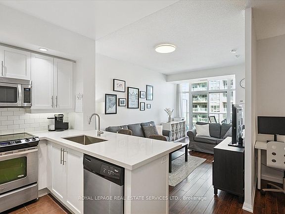 Welcome to a stunning 1-bedroom plus den unit in the heart of Liberty Village. This beautifully presented condo offers high ceilings, an excellent layout, and great views. It also comes with one owned parking spot and a dedicated storage locker. Step into the open-concept living and dining area, where quality hardwood floors create a warm, inviting feel. The space extends to a private balcony, an ideal spot for summer barbecues while enjoying the views. The recently updated kitchen is a chef's dream, featuring sleek quartz counters, a custom ceramic tile backsplash, white painted cabinetry, and stainless steel appliances.The versatile den, with its own closet, is a true bonus, perfect for a home office, a personal gym, or a guest bedroom. The spacious main bedroom is a tranquil retreat with a double closet and built-in organizers. Liberty Lakeview Towers elevates condo living with an unbelievable list of amenities. Residents have access to a 24-hour concierge, a full security system, and ample visitor parking. The recently refurbished rooftop party room and expansive terrace offer exceptional views of the lake and city. You'll also find a well-equipped gym, an indoor pool with a separate whirlpool and sauna, a new kids' playroom, a movie theatre, a billiard room, a golf simulator, a games room, and even a bowling alley! Five comfortable guest suites are also available for overnight visitors. Living here means being at the centre of it all. You're just a short commute downtown and steps away from a huge selection of popular brunch spots, patios, gyms, and grocery stores. Enjoy an easy walk to BMO Field, Budweiser Stage, lakefront parks and trails, Exhibition GO and the TTC, Trinity Bellwoods and King West. This gorgeous, move-in-ready condo is a must-see. Don't miss out - come visit it soon!