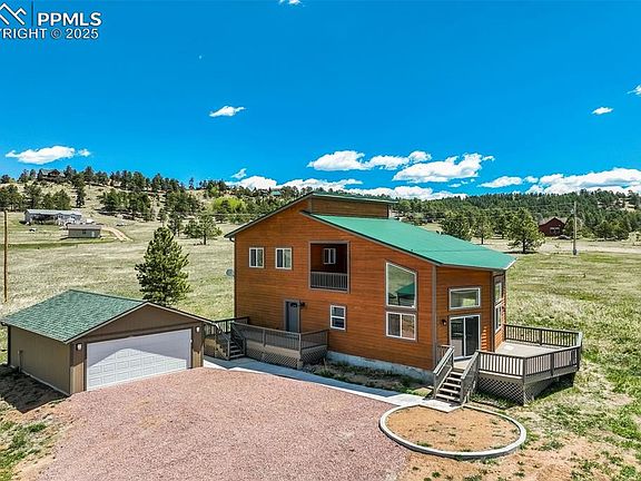Welcome to your peaceful mountain escape in beautiful Florissant, Colorado! This immaculately maintained 3-bedroom, 2-bathroom home offers just over 1,600 sq ft of inviting living space, where rustic charm meets modern comfort. Nestled on a private 2-acre lot, this home delivers the perfect blend of seclusion and convenience. Step inside to find a warm, light-filled interior with thoughtful updates throughout. The upper-level primary suite is a true retreat, featuring a sitting area overlooking the main level and a private balcony—perfect for enjoying your morning coffee or stargazing under the Colorado sky. Outside, a freshly stained deck extends your living space and invites you to relax or entertain. Car enthusiasts and hobbyists will love the two detached garages with electricity, offering six total parking spaces—plenty of room for vehicles, toys, and tools. This home is set back from major roadways but still offers easy access via well-maintained county roads like CR-1 and County Rd 42, providing peaceful privacy without sacrificing year-round access or commute convenience. Additional highlights include a radon mitigation system, professionally cleaned interior, and recent septic service—making this home completely move-in ready. Whether you're looking for a full-time residence, a weekend getaway, or a smart investment, this mountain gem is a rare find. Don’t miss your chance to own a slice of Colorado mountain life—schedule your showing today!
