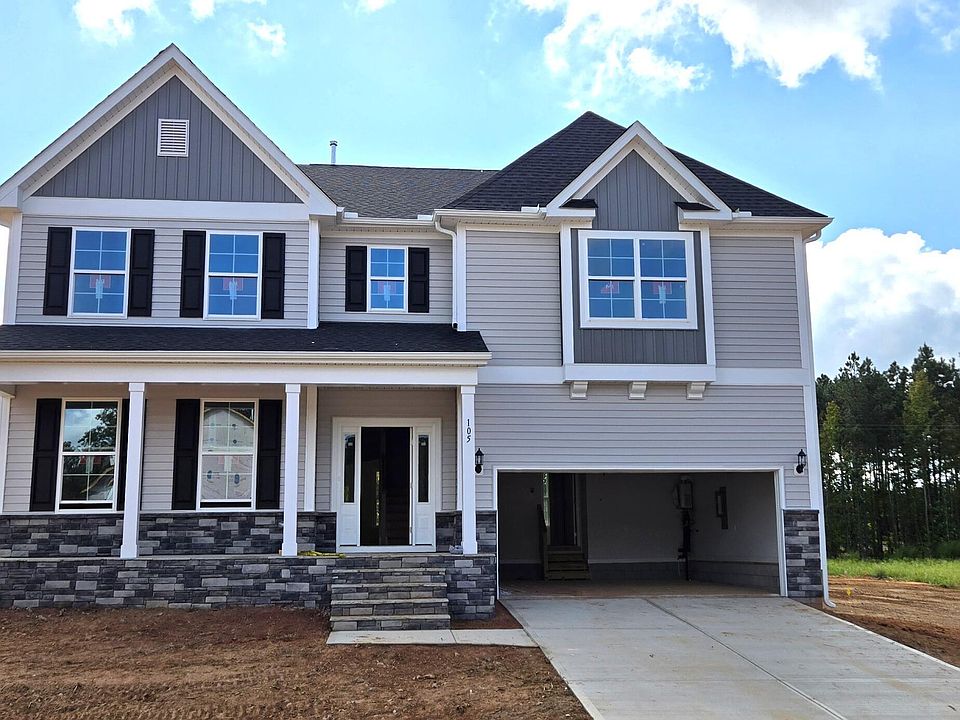 Set on a wooded 0.8-acre corner homesite, this beautiful 5-bedroom home offers the perfect blend of space, privacy, and luxury. Highlights include a 3-car garage, a main-level guest suite with a full bath, and a sunroom filled with natural light. Durable and stylish luxury vinyl plank flooring extends throughout the entire first floor, upstairs hallway, and loft. The gourmet kitchen is thoughtfully designed with upgraded Brellin PureStyle white full-overlay soft-close cabinetry, a 5-burner gas cooktop, built-in oven with convection microwave, concealed-control stainless steel dishwasher, Siberian Frost quartz countertops, pendant lighting, tile backsplash, a large island, and crown molding. The formal dining room features elegant arched entryways, a coffered ceiling, and access to a butler's pantry. The great room is warm and inviting with a tiled fireplace and mantel, crown molding, ceiling fan, and an abundance of natural light. Upstairs, the primary suite boasts a tray ceiling, plush carpet, and a huge walk-in closet. The spa-like bath includes a freestanding soaking tub, a tiled walk-in shower, dual quartz vanities, tile flooring, and a linen closet. All secondary bedrooms are generously sized with walk-in closets, and the spacious loft offers flexible living space ideal for a media room, office, or playroom. Step outside to a 14x10 covered porch that overlooks a private backyard—perfect for relaxing or entertaining. Stylish, functional, and move-in ready by mid-October—don't miss this incredible opportunity!