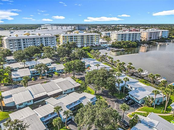 Enjoy the most beautiful sunsets from Dolphin Cove. This charming community offers bike and kayak storage. This particular unit includes a deeded boat slip (#22). Golf carts are allowed and encouraged here in New Smyrna Beach. Re-inforced community seawall revetment was done in 2023. Enter into the light and bright open concept for easy flow from one room to the other while entertaining , relaxing, or cooking in the kitchen. The kitchen has beautiful high end stone counter with new appliances. New hurricane windows and doors installed 2021, central HVAC, tankless hot water heater, and LVP flooring. Laundry is located inside one of the bathrooms for convenience. Head out back to the patio and relax with a cup of coffee or entertain your loved ones while preparing a meal on the grill. Make this adorable 2/2 your permanent getaway. NEVER FLOODED Dolphin Cove is located between Canal St and Flagler Ave. New Smyrna Beach, galleries, restaurants, bars, shopping, surf shops are all just a short walk, bike ride or golf cart ride away.